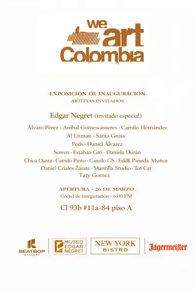 We Art Colombia is an independent artist collective which, during its history has curated and invited important contemporary artists from Colombia to be showcased in some of the biggest art events in major cities around the globe. Such cities include New York, London, Rome, Bogotá, Miami and Tokyo.