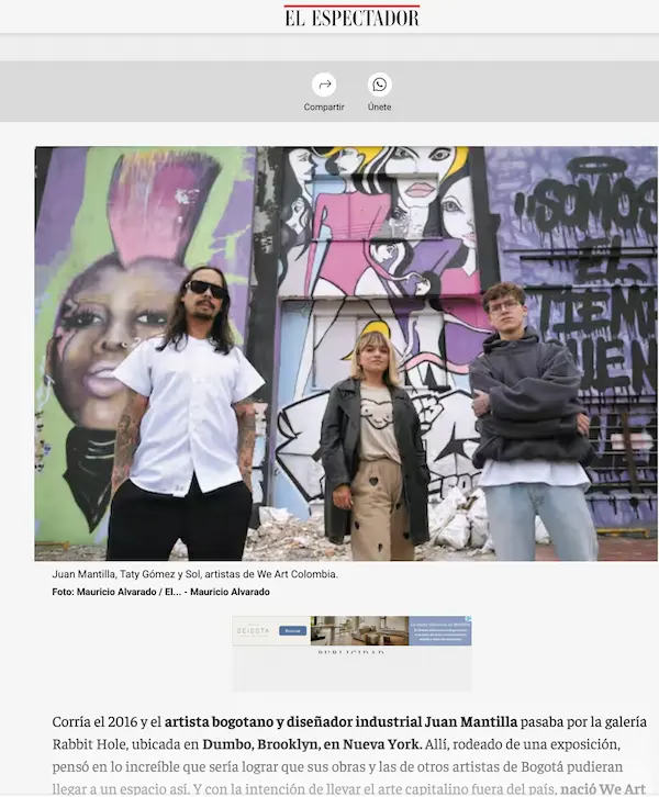 We Art Colombia es el colectivo de jóvenes que trabajan por llevar el arte urbano colombiano a otras partes del mundo. El grupo fue creado por Juan Mantilla en 2016 y a lo largo de los años han pasado más de 80 mujeres y hombres que desde entonces han expuesto sus obras en galerías de Bogotá, Nueva York, Londres, Miami, Tokyo y Roma. Actualmente, algunas de sus obras están en la galería Beat Bop, de Mantilla, en el Distrito Creativo de San Felipe, en la localidad de barrios Unidos.